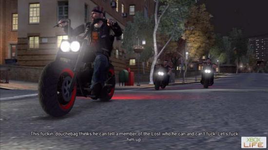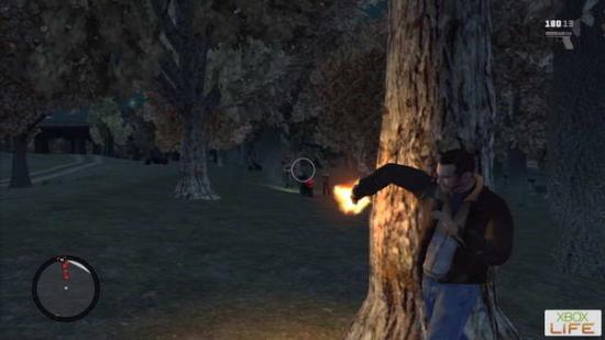 男方原来是飞车党的头头,在一段追逐后他会伙同其他车友出来给你颜色瞧瞧,大伙来到一个公园处展开火拼,多利用树干作掩护射击(RB)将这伙飞车党全部拿下,最后捡起头头的霰弹枪即完成任务。