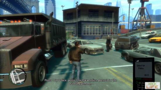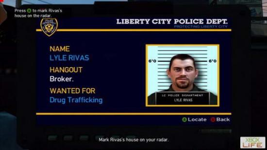 Roman的朋友Bruice(总是觉得自己很壮的那位…)最近似乎有点搞头,Roman也希望阿尼快点去找他,Bruice要你先去偷台警车,然后透过警车上的电脑查询某人的资料,若看到警车通过就直接动手开走吧(等不到警车可以用电话打911然后输入1,警车很快就自动来给你抢了),消除被通缉的星星之后把车停在路边,按LB进入电脑系统后,选「Search Police Records」然后「Search by Name」,接著透过萤幕的键盘输入「LYLE RIVAS」,你就能知道要干掉的人在哪萝。这位药头会开车往高速道路逃,想办法把他弄死即可。