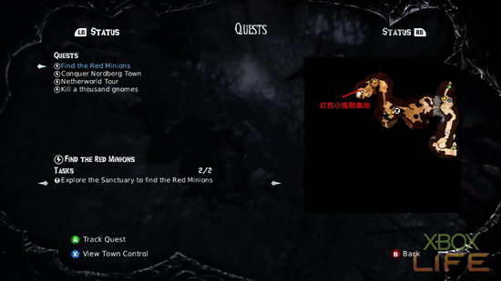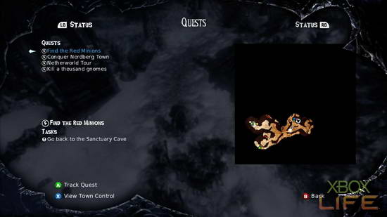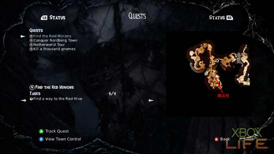 玩家再度回到城镇的外头,进入城镇前必须先把著火的入口弄熄,这时就需要红色小鬼的协助,因此玩家必须先完成寻找小鬼的任务。朝著雷达标示的方向行走,玩家会回到树精(Dryad)把路口挡住的洞穴。此时玩家可以发现在洞穴入口的不远处,发现一座奇怪的突起物,只要玩家命令十五位小鬼围绕在突起物四周,并且靠近它按下手把X键,魔王便能化身成为一名小鬼突袭树精。