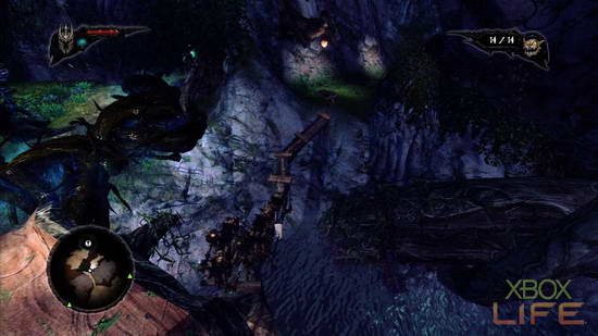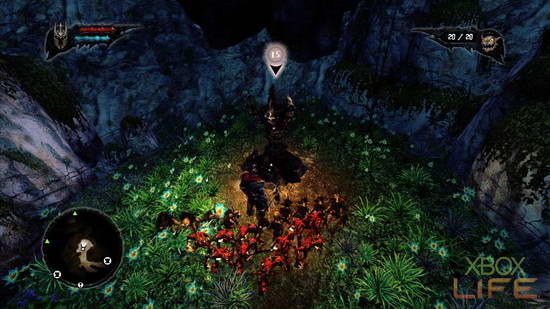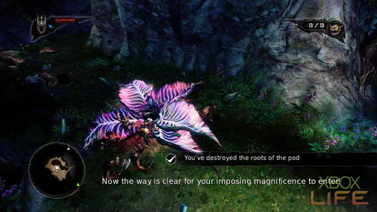 当玩家化身为小鬼后,便可以带领小鬼群从木桥的另一头,绕到树精的背面偷袭她。当玩家把树精解决之后,记得要把一旁的重生之花给破坏掉,不然树精会不断地复活,这样一来就会没完没了。所有敌人都清除完毕后,按住手把X键就可以变回魔王本尊,接下来只要顺著之前被树精阻挡的路前进,就可以顺利进入精灵圣地。