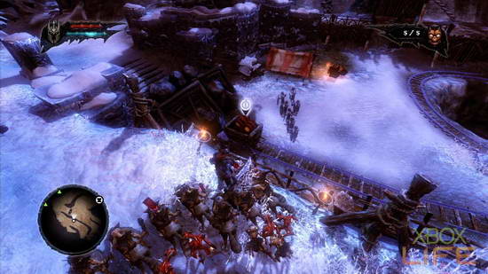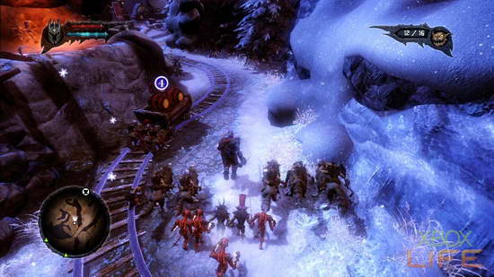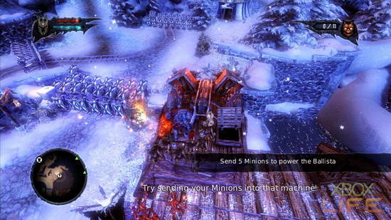 到达矿场时,千万不要急著与军队战斗。玩家可以利用褐色小鬼,通过一旁的木板跳跃至军队后方的开关上。命令小鬼把开关扭开后,载满炸药的矿产车会从下面出口滑出,玩家就能利用红色小鬼点燃炸药,炸毁阻挡路口的阻碍物,或者用来炸军队。