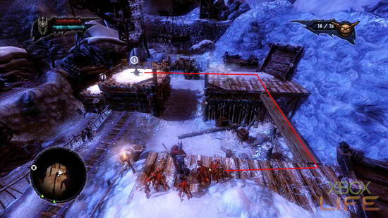 解决掉驻守在魔王塔传送点的军队后,玩家会看到左右二边有著火的阻碍物,右边的阻碍物后面会有许多军队以及火力强大的弩抱,因此玩家必须从左边绕至军队的后方,并且把弩抱抢夺下来。