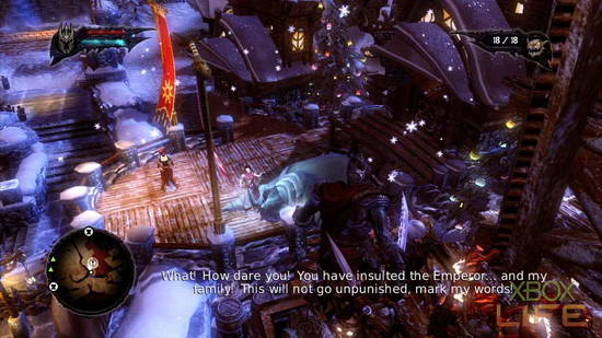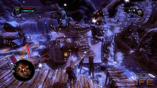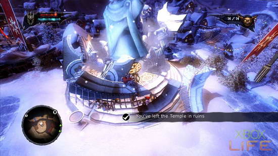 进入城镇后,一路往左边的道路走上去,路途上玩家会遇到许多丢炸药的村民,玩家可以命令红色小鬼前往攻击。走到雷达所标示的地点后,便会进入一段动画,接下来只须命令小鬼破坏神殿,并且把雕像推下去击毁障碍物即可。