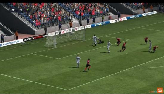 这次FIFA 13把草皮的颜色和色调方面做了很大的调整,起码看着眼镜舒服了,没有那么昏暗了。