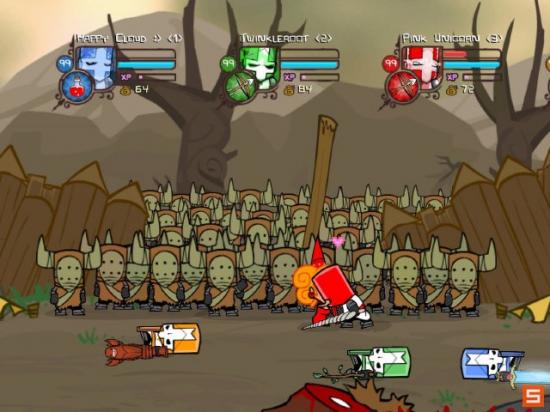 《Castle Crashers》整体上看非常出色,特别是在视觉效果方面,采用的是知名画家Dan Paladin的漫画风格。给人印像相当深刻,本作的游戏操控非常简单,容易上手,不过也加入了一些技巧方面的内容。游戏的Q版画面非常养眼,角色动作表情逼真而风趣。