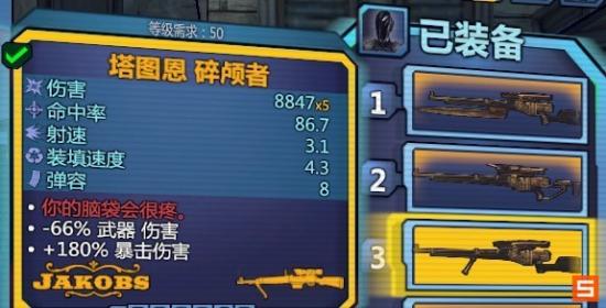 其实个人很崇尚JAKOBS的武器,威力大,而且没有属性,用紫薯武器覆盖一个敌人后,用JAKOBS的武器可以轻松完杀。这把稍微逊色于刚才那把,但是暴击起来却比那把高很多。
