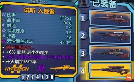 HYPERION的武器刚好和J厂奇异的后坐力相反,武器越打越准,战斗发挥稳定,没有碎颅的威力,也没有大倍狙击镜也没有鲁达的射速和载弹量……所以位居最后……