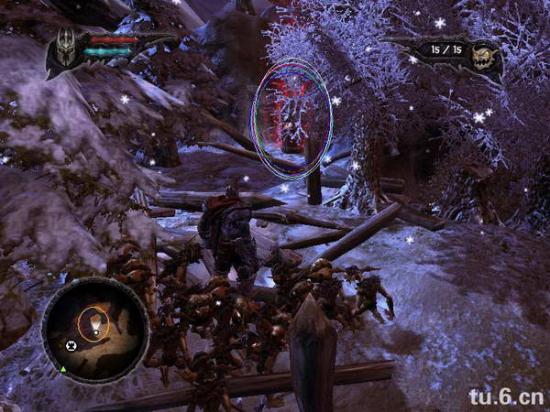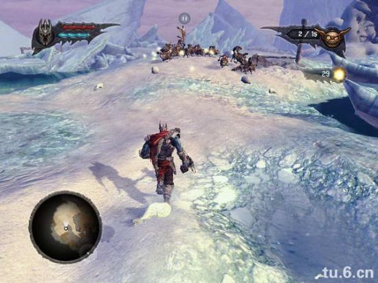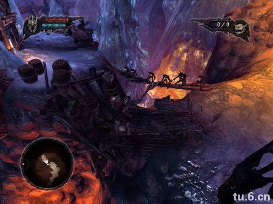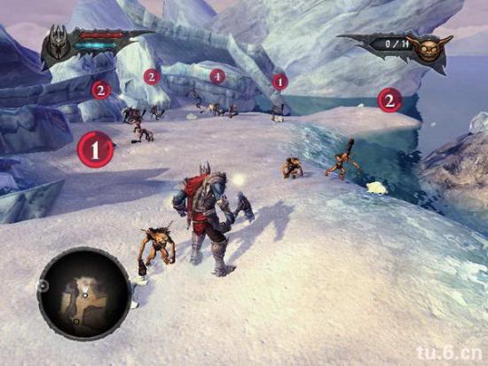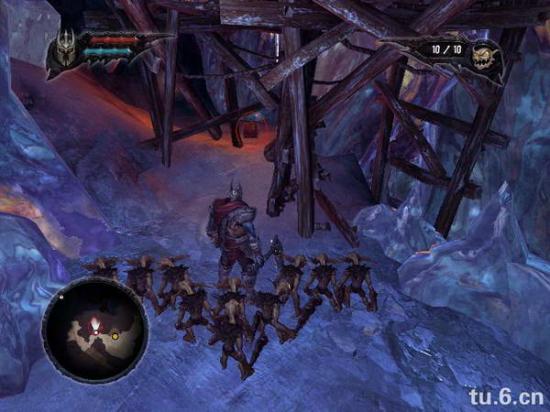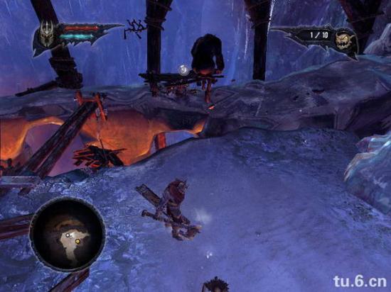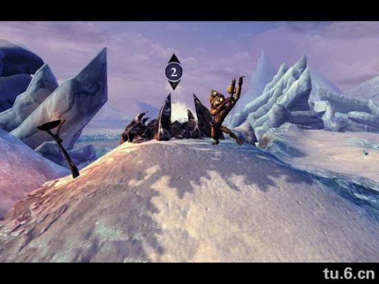之后你会看到个冰封大猩猩,打开冰块,猩猩跑下去,然后召唤小鬼,和小鬼一起把它脚上的冰打掉。这里有朋友卡住,加大加红, 之后它会跳对面去,把旁边的支架打断,让小鬼冲过去