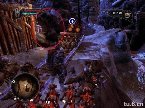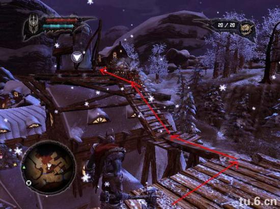 路上发现狼群,黄鬼骑上,接着前进,到达目的地后,看到转轮单独在木屋顶上,这里需要狼骑,跳过去推动转轮,然后炸弹出来,打爆炸开路,继续前进
