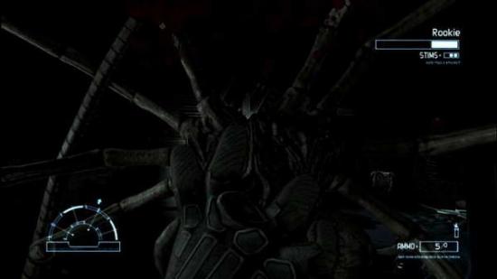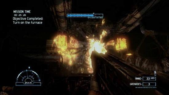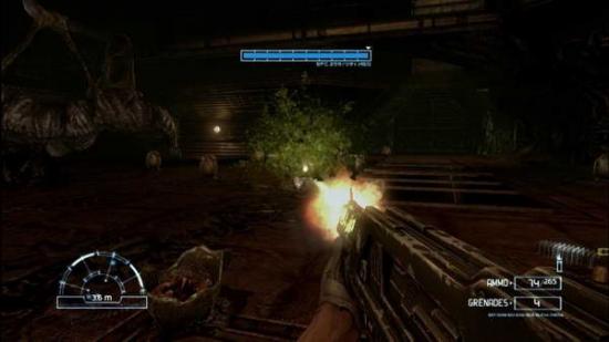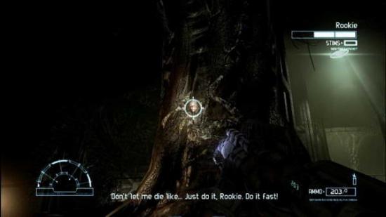 相当麻烦,被挂脸上就是三分之一血,毫不含糊,之后需要去拿个紧急发电机,就在房间外的走道里,E起来E进去,然后跑进电梯,电梯停下后一路走到屋顶,E下电脑,然后重新回到电梯中,到底后走向桥面,这是会有一大群异形从对面奔过来,小心处理掉,走进洞穴,到了最深处,会有个玩意要你破解,E了后发现还有好一段时间才能破解掉,于是带着一群异形绕圈子,将其全部消灭后,破解也终于好了,回去再E下,便可进入电梯,电梯出来后进屋子E下电脑,出来后往箭头指示地点前进,沿着楼梯走到地下的池子处,有个人被困在树上了,