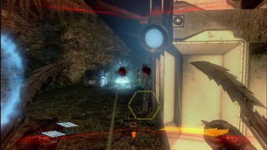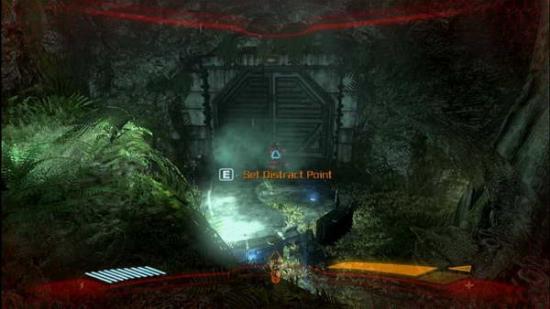 第二章 Jungle跳跃一次后,Z可以缩放视角,F可以进入热能扫描模式,可以看到人类的行迹,按R可以进入隐形状态,当然不是完全隐身,只是难以发现而已,之后干掉两个人类,前行到门口,出现了蓝色光波炮台,这里按E可以选择目标,