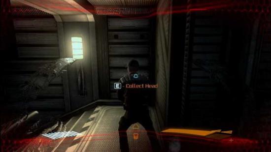 之后E掉控制器,顺带回点能量,走上二楼,里面有个目标人物,要拿他的头,千万不要用别的方法杀掉,可以用E将其诱惑道门后,从背后取下他的头颅,