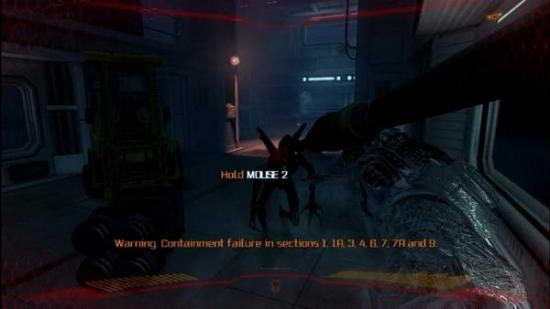 之前拿到的那根长矛这关能大派用场,事实上,我这关就只用了它,肉搏都省了,整关我始终处于隐身状态,加上遇敌就中键举长矛,CD很短,无比实用,但再遇到2个以上异形时需要良好的跑位,一路叉叉跳跳,先把电源控制器打烂了(就在一个可控充能的开关上方),接下来又需要拿头,这时可以到楼下等他走过你上方,
