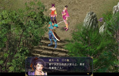 从少林山脚出地图西北的出口,终于在入山松林前这里,小鱼儿追上了神秘女子,对话,拜托她救治释严大师,任务就此完成。