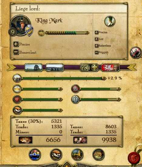 让符合最多条件的骑士和姑娘们进行经济性联婚,然后该骑士每次升级只加reign(统治力,每点增加3%收入);如果该骑士是warlord更好了,技能就加liege(臣民,每点增加2%忠诚和10%总收入);把你收入最高的3个省份扔给他,其他省份也如法炮制。