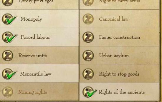 mercantile law(贸易法)+75%贸易收入-1粮食增长-10%军事。超值,不过要注意别让粮食增长为负即可。