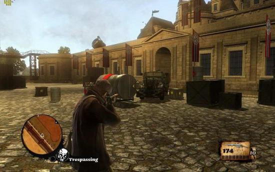 很多人问怎么刷10个双杀。。其实答案就在上图,大家打开地图,位置就在凯旋门那里,躲在进入HQ的那个门口(上图位置),只要触发警报就行了,一般敌人一来就是好几个,由于这里只有这一个入口,所以敌人很容易互相重叠,找准机会一枪就2个,杀10个双杀很简单。PS。4机警报后如果想逃脱,也只要向HQ那个方向的农村跑就行了,没有任何NAZI会追过来!