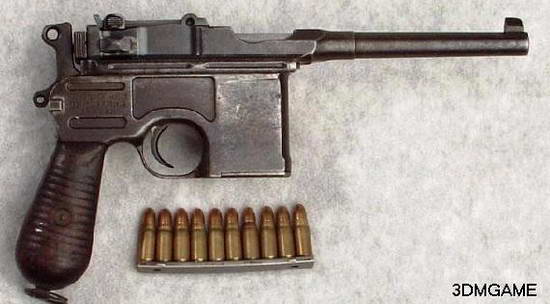 真名应该是 Mauser Military Pistol (外号 驳壳枪)口径:7.63mm 全长:34.55mm 重量:1.24千克 弹容:20发 德国毛瑟兵工厂中Fidel. Friedrich. Josef Feederle 工作空虚时间 做着玩 做出来的 各类数据比鲁格P08 差 但是造价便宜 在中国大量被使用 游戏中 为何只要8发子弹 这得去问游戏公司的 粗制滥造了