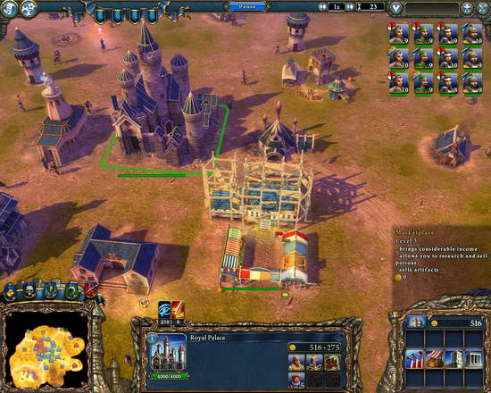 接着放下市场和教堂,升级血瓶,招募牧师。并在左上角、右上角、右下角放下三座哨塔,建立稳固防线,左下角的巨人进攻时间较晚(10天左右),晚点补塔并升一级(主要是现在没钱,嘿嘿)。塔就是你的肉盾~