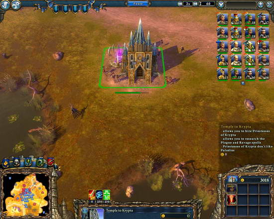 野外还有特殊的空地可以建造 Temple to Agrela(安格瑞拉神庙)和Temple to Krypta(克莱普塔神庙),是不是很熟悉。安格瑞拉还是能生产护士,但是克莱普塔生产的女祭司比一代强很多,一样能招不死小弟,一招一大片,自己抗怪很轻松,相当强劲。问题是她不喜欢Paladin(圣骑士),可这关根本不能招圣骑士,完全无所谓。