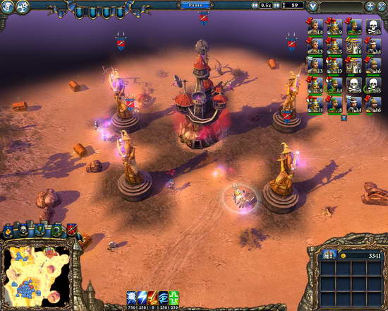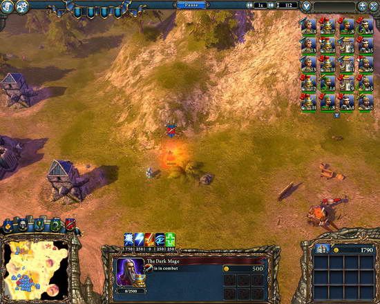 最后在地图最北方偏东一点,发现Dark Tower(黑暗之塔),周边有五个魔法塔保护,攻击力很高。矮人有抗魔,还有强力拆建筑技能,仍然是主力,但是一定要花重金悬赏,几个矮人是办不成事的,一定要人海战术,还要有心里准备,英雄等级不高会伤亡巨大。