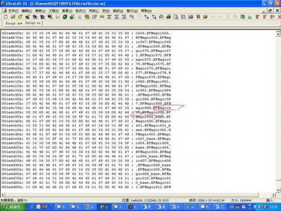 从BFMagic590. 的B开始,由于GenSkillStart014.比BFMagic590. 长,会一直覆盖到BFMagic599.如图:BFMagic590. BFMagic599. 变成了GenSkillStart014.c599.修改后 情意技:火凤展翼也是发不出.存盘起动群七,用修改把武将改带手里剑特性.有千人战时候.发手里剑时,其实会发动武将技:极˙遁甲玄秘.再改一下手里剑发动机率.超强.武10点,打大怪也不是问题.参考图红线部分,有些武将技修改后是打自己.比如BFMAGIC.INI里ATK方式是1的会打伤自己.ATK是5的是向前发射的.能用.修改后,发武将技时不是无敌状态,会丢血,极˙遁甲玄秘例外.加快手里剑发动机率.999血也很快死掉.而且发动时候是无敌.