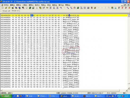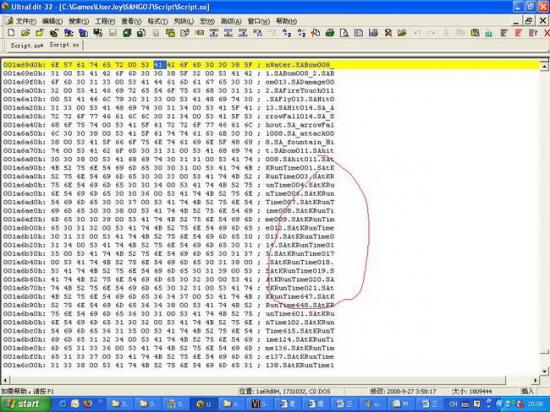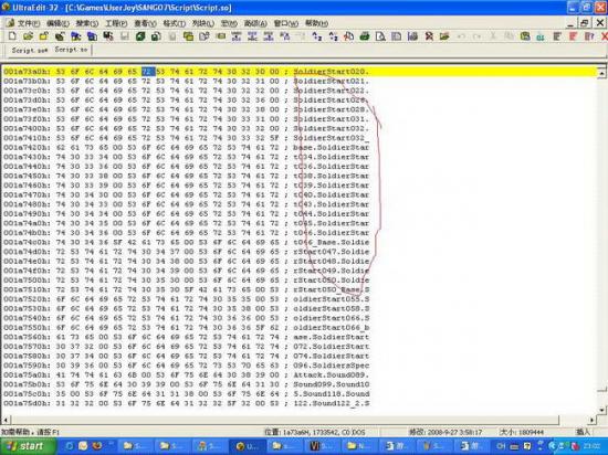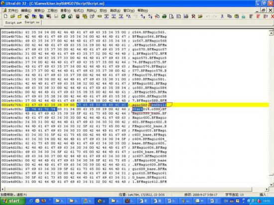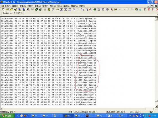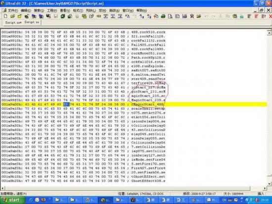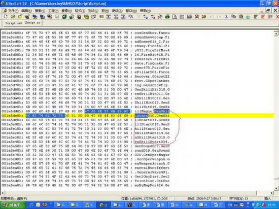 用UltraEdit打开Script.so,用搜索功能找到这么几行GenSkillStart010. GenSkillStart011. GenSkillStart012. GenSkillStart013. GenSkillStart014.这些是武将在千人战发冷箭,短戟,铜锤,飞刀,和手里剑等的暗器,图中红线所示,用手里剑为例:GenSkillStart014.发射点.把GenSkillStart014改成GenSkilStart114.屏蔽此这功能.记得最后结尾是点,16进制是00,而不是2E.