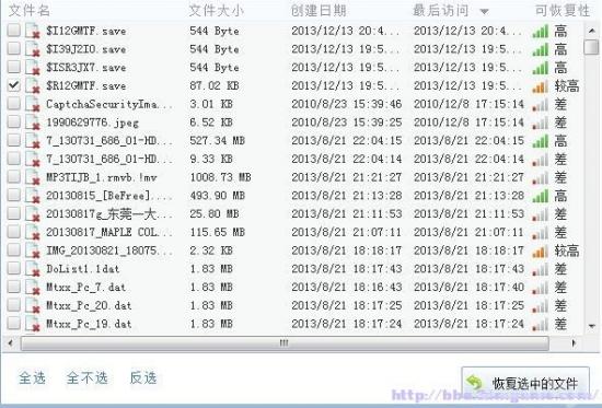 扫描完以后,按最后访问排序,会看到前面几个是save后缀名的文件,因为我刚才删掉的存档文件是87.2KB的那个,所以我是要恢复 $R12GMTF.save 这个文件