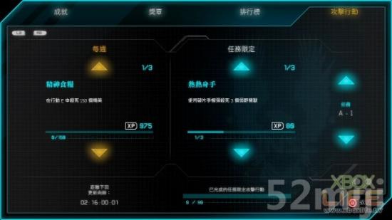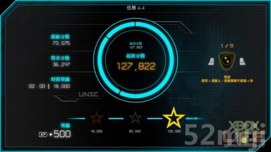 在任务完成之后,会结算奖章以及杀敌数计算总分,玩家可以不断重玩挑战新的高分。而总分也分成铜、银与金三种评价,不同关卡的评价要求分数都不一样,达到越高的评价就能够获得越多的XP,而XP就可以让你去购买新的武器以及增强器。所以想要拼高分的玩家可以重複努力,或者是开启不同的骷髅来挑战。游戏中也提供了奖章的浏览页面,以及与《Halo4》系统相同的挑战系统。每个礼拜会更新不同的挑战,达成这些挑战也能获得额外的XP,三不五时开启游戏来体验绝对是非常棒的感受。