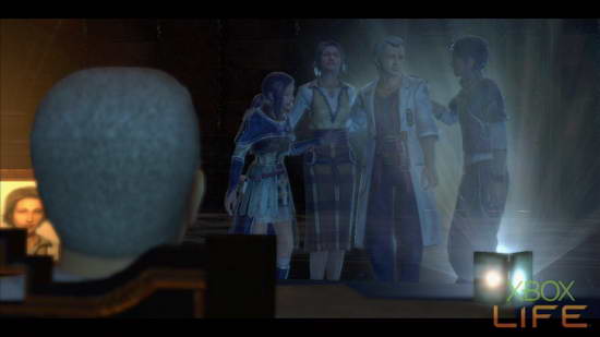 多鲁卡鲁窥视著发出强光的门缝后,和大家点点头,一伙抽出武器准备破门而入,门中男子露出浅浅的微笑,男子正在看著拉修一家人的影像石。此时拉修一伙人拿著武器衝进室内。
