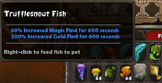 前面卖了个关子,关于Fishing luck。钓鱼看起来很鸡肋,钓些鱼给BB吃,变个外形,不管变多厉害,BB最终是个辅助,撑死变成BOSS也不过是玩家们的手下败将。但是钓鱼可以钓出很多从别的地方无法得到的东西!除了短时间加抗性加元素伤害的鱼(给人吃的)之外,还有加跑速加护甲加格挡的,这些东西平时可能打小怪都来不及想到去用,但是BOSS战前吃一个还是很不错的。最为怨念最为强大的存在莫过于: