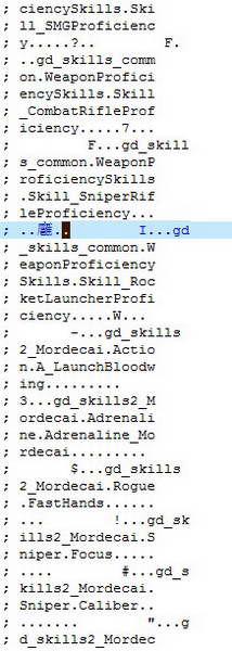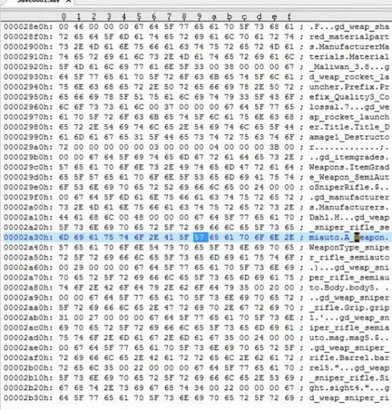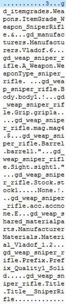 无主之地里面,存档中是以下面这样的方式来记录每一把枪的,如图(原图由沸腾金属提供,稍作修改)