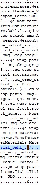 中间那一段,就是parts列表,可以看出,有很多武器类型的parts是没有4号或者5号配件的,不足的是这些文件里不会告诉你哪些是UniqueParts。