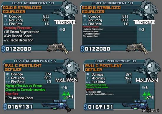 我把字体大小改成9之后的效果,两把左轮,一个职业MOD,效果很明显了…发现即使同样是Give Sick红字的左轮,触发元素伤害的几率也是有高有低,改完字体后好不犹豫的把原来那把触发几率是High的换掉了。