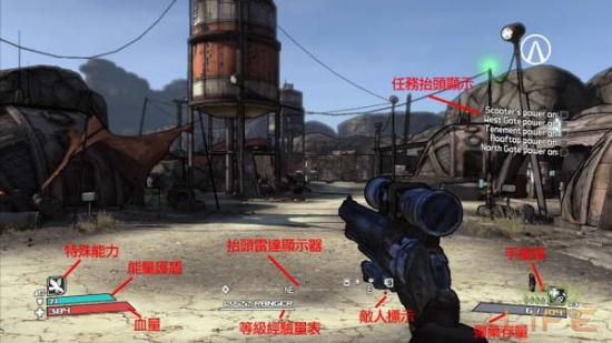 在四位旅行者中选择一位喜欢的角色后,玩家将可透过逗趣的机器人,学习一些基本的游戏操作方式。机器人会帮助玩家开啓其它的辅助功能,更快了解角色的即时状态。画面左下方会显示角色的特殊能力、能量护盾与血量;正下方与右下方分别为雷达显示器、等级经验量表、手榴弹存量与使用中武器的弹药存量。