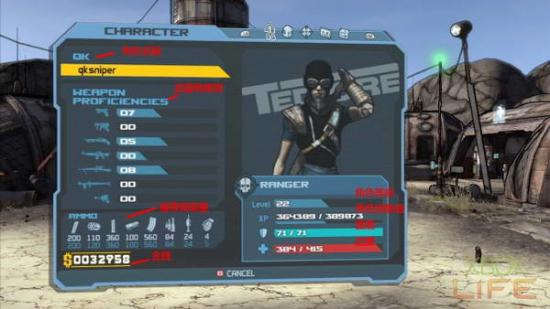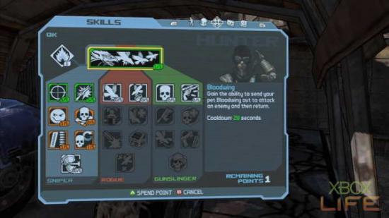 角色技能栏:当玩家等级达到五级时会获得一点的技能点数,按下手把BACK键进入角色选单后,选择SKILLS(技能)的栏位,玩家就可以把获得的技能点数加到特殊能力技能格裡。值得一提的是,第一次获得技能点数的玩家,只能点选特殊能力技能格,之后在每一次升级裡都会获得一点的技能点数。游戏裡的每位角色最高等级可达到五十级,最终可获得四十五点的技能点数供玩家升级。每一阶段的技能必须点满固定的技能点数,才可以点击下一阶段的技能,并且三个栏位的技能都是独立出来的,例如玩家想要升级红色栏位第二阶段的某个技能时,必须先点满第一阶段所要求的技能点数才行。