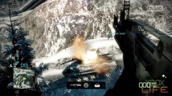 延用前作的弹道与子弹飞行时间之设计,《战地风云:恶名昭彰2》可说是更加强化这个部份,尤其是使用狙击枪射击远距离的敌人时,效果更为明显。由上图所示,笔者使用狙击枪攻击目测距离二百公尺的攻击直升机,瞄准的地方为副引擎排气口的下方,但是弹著点却为十字准心上方二格的地方,并且子弹会以明显的弧形弹道飞行。经过笔者重新调整过瞄准点后发现,如果玩家想要在二百公尺内距离击中敌人头的话,瞄准点必须压低一点。