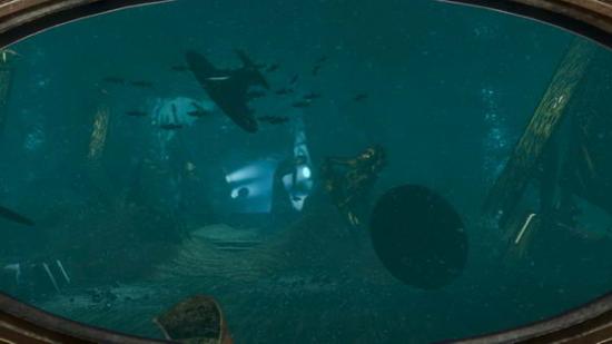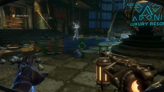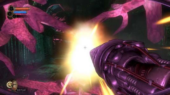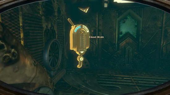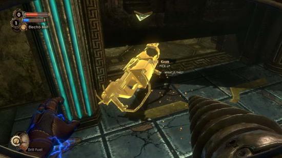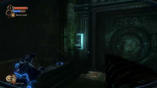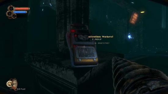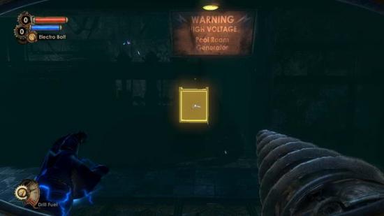 从地上站起来,耳边萦绕着小女孩的声音,穿着厚厚的潜水服向前走,右手的钻头不要随便用哦,耗能源的,从右手边的楼梯上去,会使用到一次钻臂和C,
