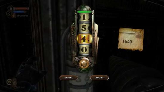 向左看能看到一罐煤油和一个密码锁,密码就在右边的纸片上,开之然后F走人。走吧,对着那块黄的发亮的板子点一下