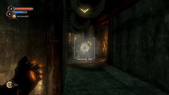 准备好左手的技能,机枪,还有。。。一直拿在手里的照相机,给他来个写真吧。接下来跟着箭头走一段,看到了带着小女孩的BIG DADDY,拍了他然后 干掉他,