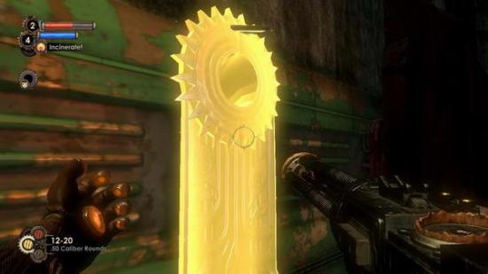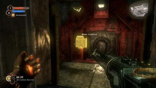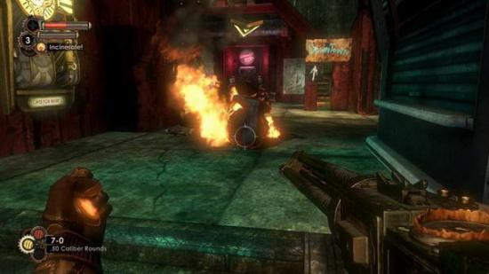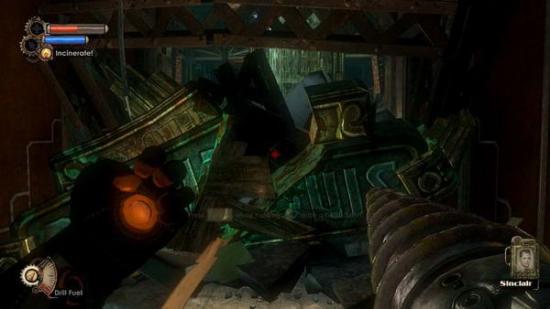 用火先烧他一下,在他硬直的时候进行攻击,如果你手快的话,他举石头的时候马上切换到隔空取物手,接住它扔的东西再还给他,打了他约摸一半血他会跑回去一下,我不知道是这样还是我躲到了他不能到的地方,然后回去用同样的办法解决他和另外不知道哪跑出来的两个疯女人。继续走,解开有密码锁的门(我的路线不是直接通往Goal的,因为我想多赚点钱养家糊口啊= =)上2楼的时候小心埋伏和机器人,还有进门后从你背后冒出来的2个AI极高的敌人,幸好女人唧唧歪歪的声音提醒了我。。。2楼那个拦着路的很猛的机器可以在另一个角度T放大后打掉。分路也探完了,接下来跟着箭头走吧,回头走到之前杀BIG DADDY的地方。。。又一个出来了。。。干之(没必要杀的,因为他身边没小女孩了,杀了也就摸摸尸体而已,浪费的弹药绝对不够- -)跟着箭头走吧,直到又一个疯子把路给堵了,之后跟着箭头去找照相机吧。其实就是之前我们已经去过的2楼,从上面的破 洞跳下去,