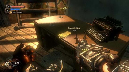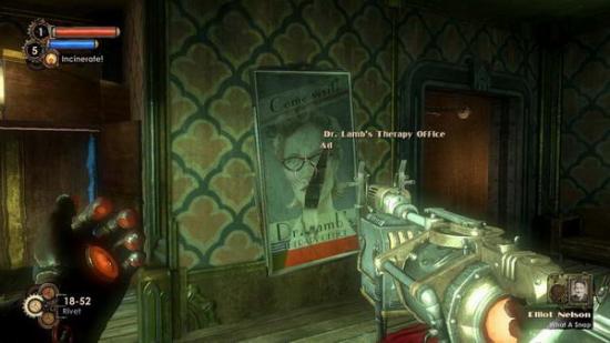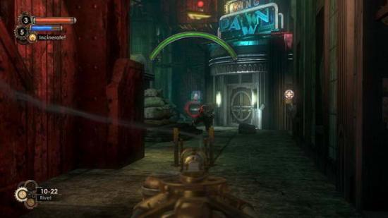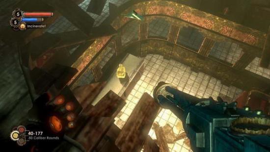 里面有你左手的技能和你的各种能力,可以在这里回看一下或者更换。在这里如果看到因障碍而无法拾取的物品,就用隔空取物大法吧,记得吸过来后按R放下哦,不要送掉右键浪费魔。OH,no,What you see?Big Daddy。OK,准备好一切,开战吧。首先是要布一部分的陷阱,然后用大威力的弹药开打,利用屋顶和屋顶的视角掩护,陷阱加神奇的左手技能,不断的躲+射,虽然小女孩的叫声有点让人不忍,但是我们还是只能这么干不是么 。
