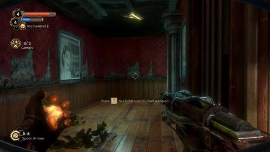 F下旁边的桶,门就开了,墙上钉着人的东西可以F下来,作为弹药,是的,因为我们获得了一把新 武器,我称它为鱼叉枪(很2的名字哦),