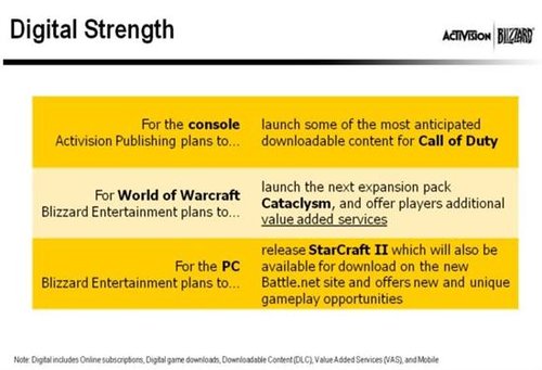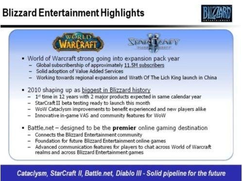 暴雪称今年可谓公司史上盛况空前的一年,有两部重量级作品安排在年内发布:《星际争霸II》,和《魔兽世界:大灾变》。《魔兽世界》的付费用户达到1150万人,为中国大陆玩家订制特色资料片及《巫妖王之怒》的努力仍未放弃: