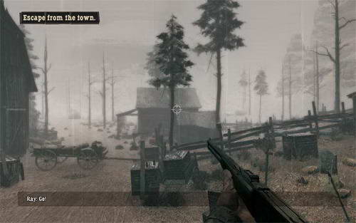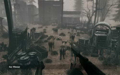 跑路过程中 刚冲过一间马厩 就被前面几只牛挡住路了 这里只要对牛开一枪就行了(就算你不开枪 Ray也会开的)