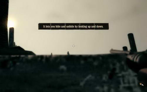 由于是蹲着的 所以【两个小提示并一起:用鼠标上下移动来隐蔽或观察并攻击敌人】