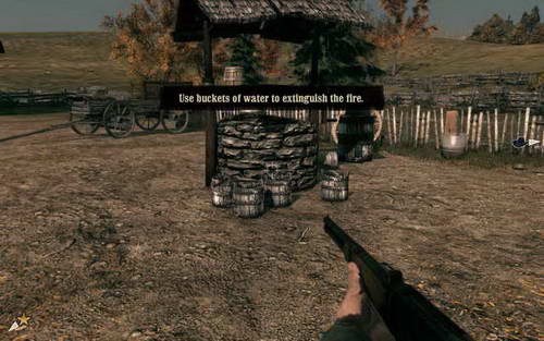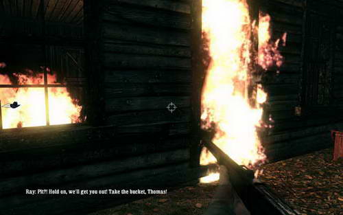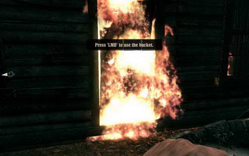 怎么办呢 玩过一代的同志估计能想起来 要去找一个东西 那是什么呢 那就是你转身就能看到的不大不小的井边的水桶 【小提示:用水桶里的水扑灭火】跑过去按F吧