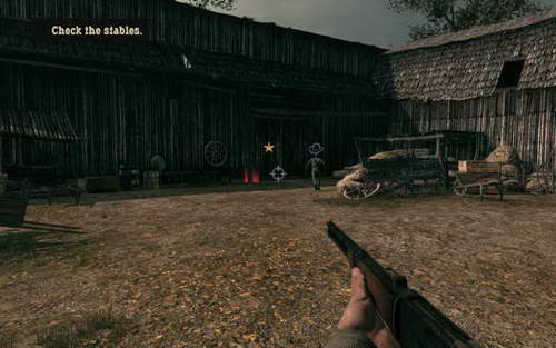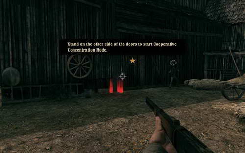 接获任务 前往查看马厩的情况 【小提示:站到门边红色的脚印那里进行协同作战的专心模式】