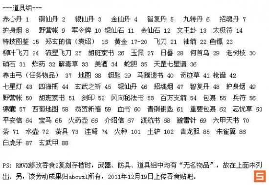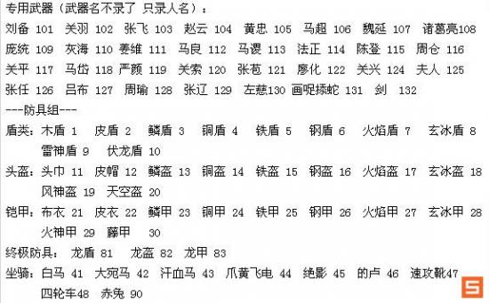 剑类:木剑 1 铜剑 2 铁剑 3 钢剑 4 闪电剑 5 怒龙剑 6 雌雄双股剑 7