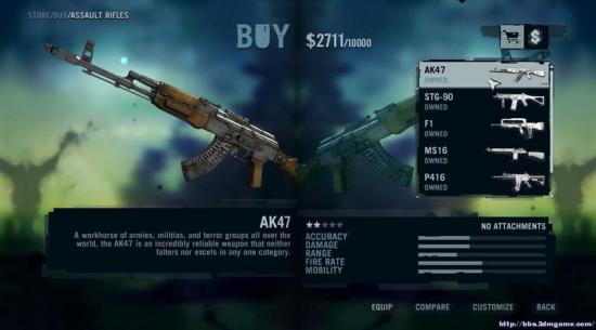 本作第一把步枪AK 47 前期杀敌满地捡 外加子弹补给丰富 前期每位玩家估计都会手里提着它满岛乱走~属性比较平庸(为啥我大AK 47的伤害那么低!!!育碧黑的太严重了)